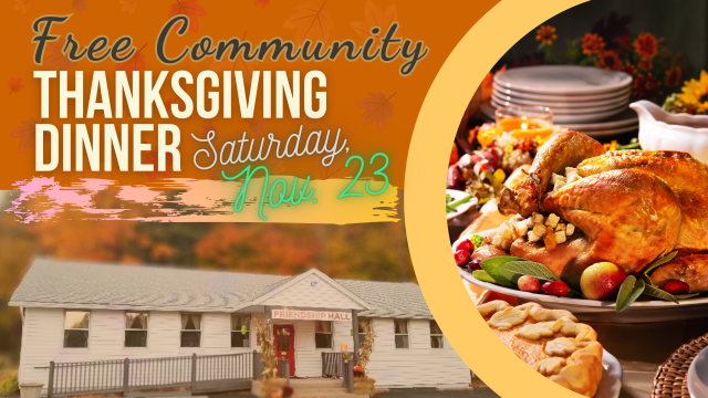 Join us for a community Thanksgiving dinner on Sat. Nov. 23 between 4 and 7 PM in the Friendship Hall at Drakestown Church. All are welcome!